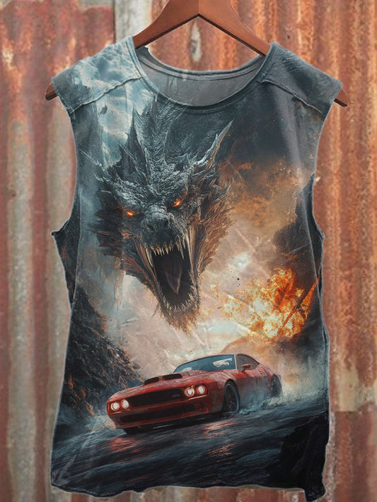 Vintage Dragon Print Casual Cotton Tank Top