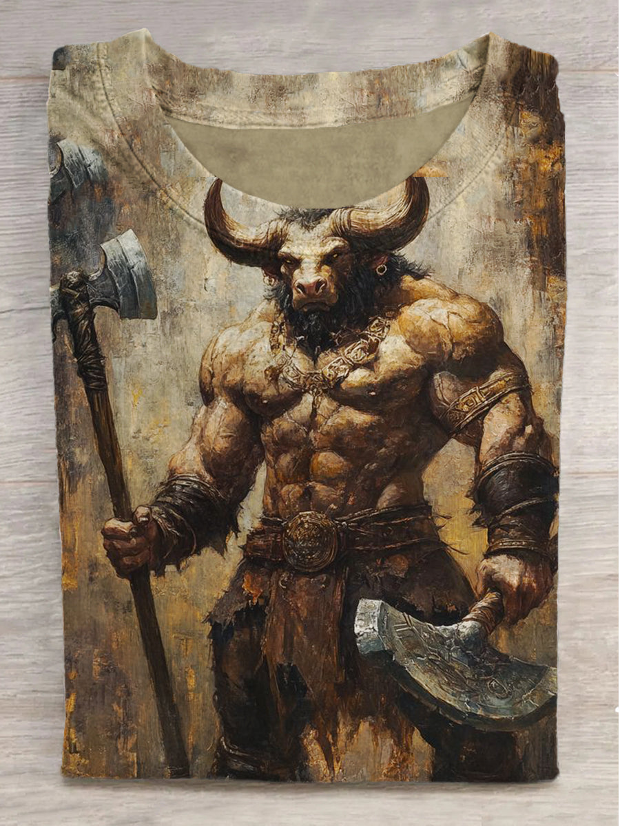 Bullhorn Warrior Print Round Neck Short Sleeve T-Shirt