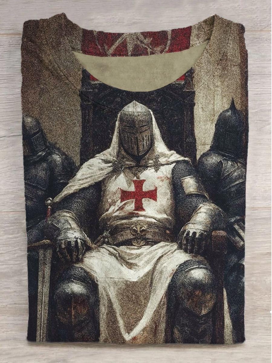 Cross Frosted Crusader Print Round Neck Short Sleeve T-Shirt