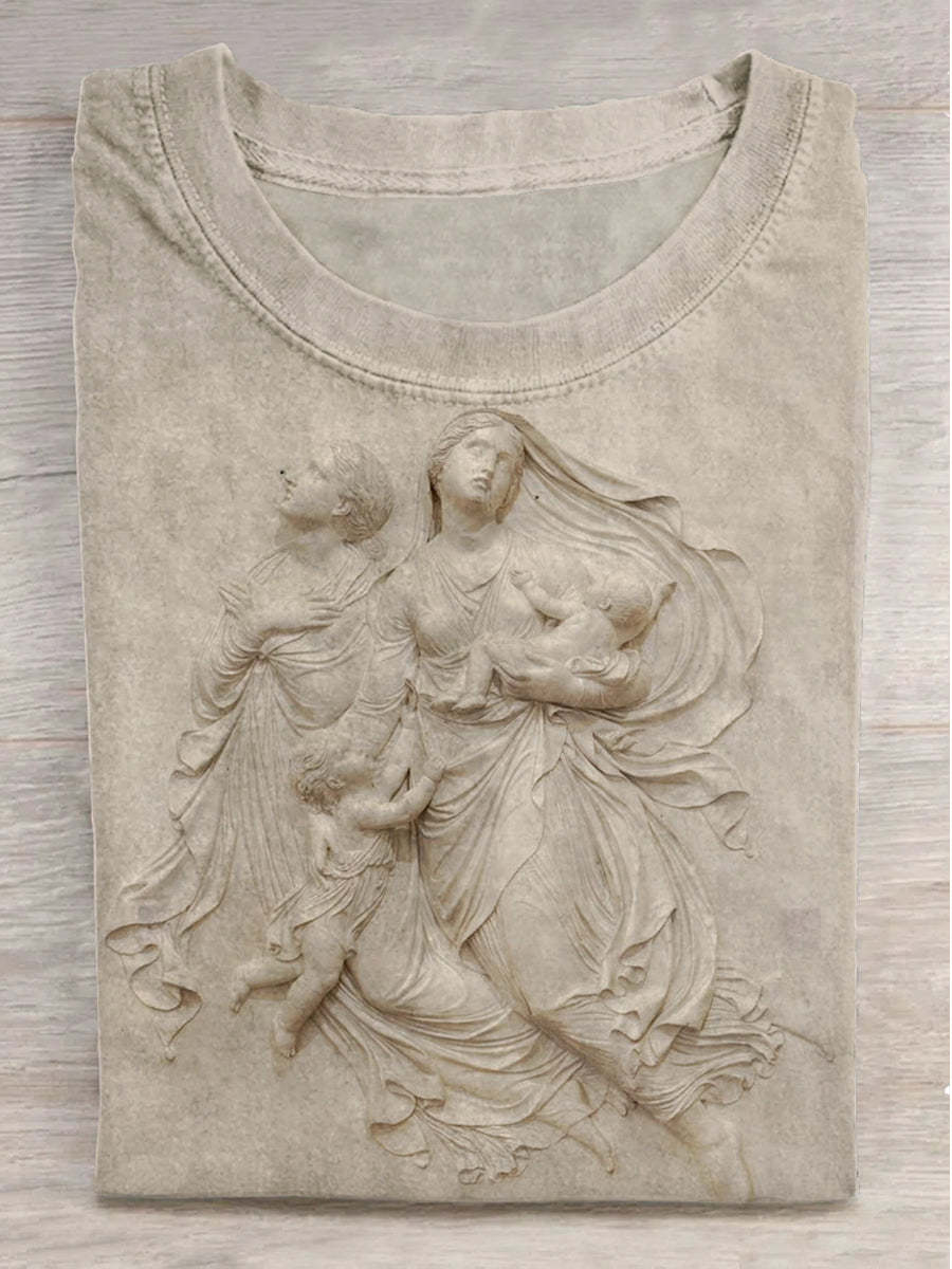 Cross Goddess and Baby Print Round Neck Short Sleeve T-Shirt