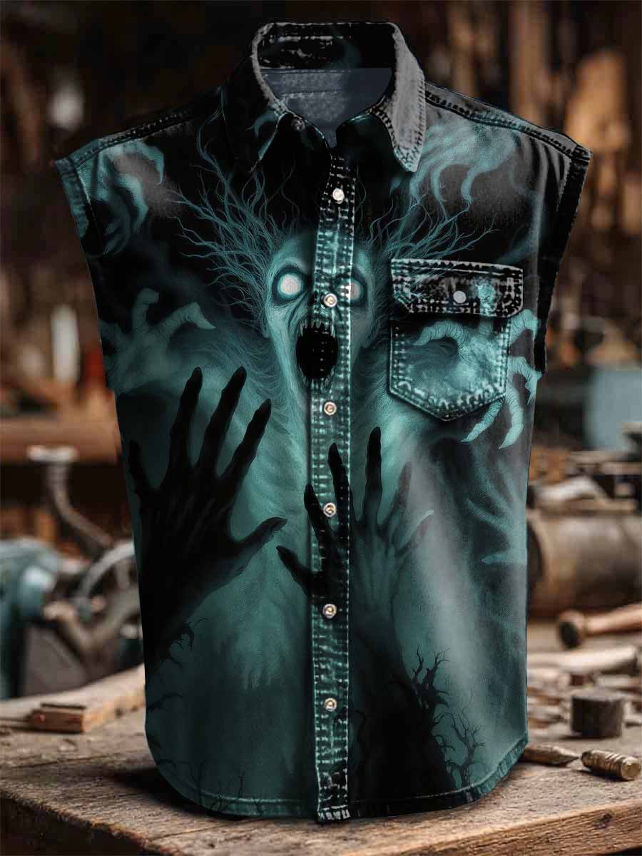 Devil Art Print Casual Sleeveless Pocket Collar Shirt