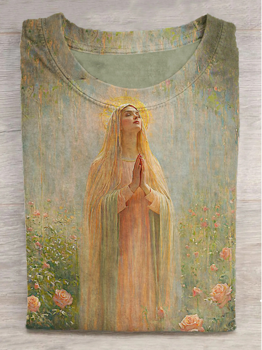 Garden Prayer Virgin Mary Print Crew Neck Short Sleeve T-Shirt