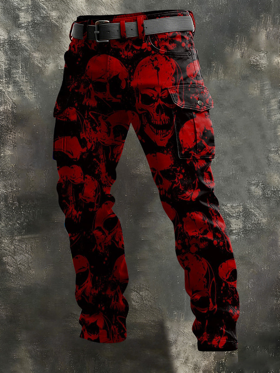 Men's Dark Blood-Red Skull Print Casual Pants