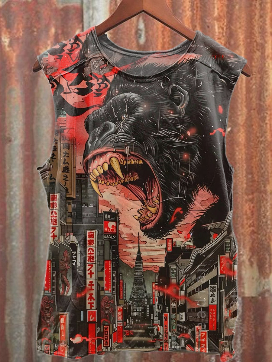 Retro Japanese Style Monkey Graffiti Printed Casual Cotton Tank Top