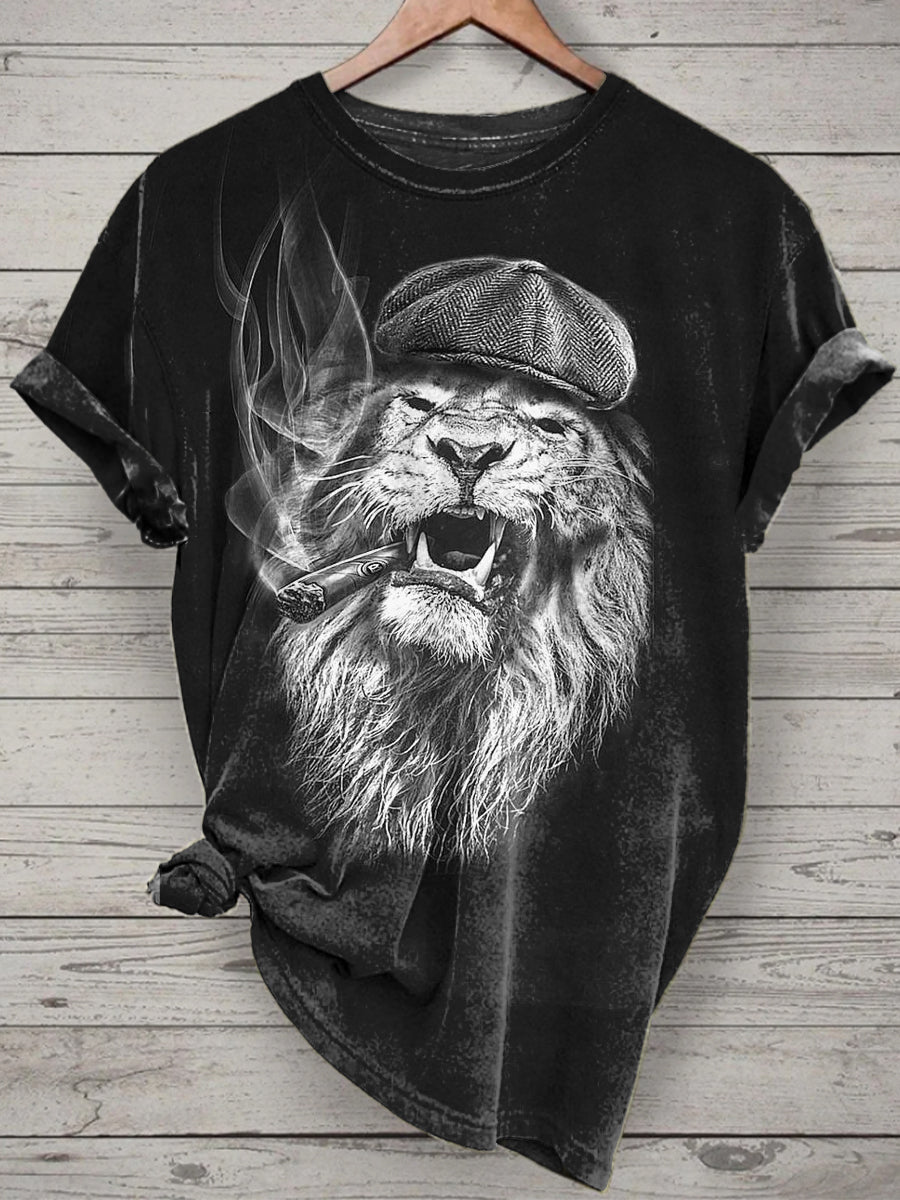 Smoking Lion Printed Vintage Fashion Loose Short Sleeve T-Shirt