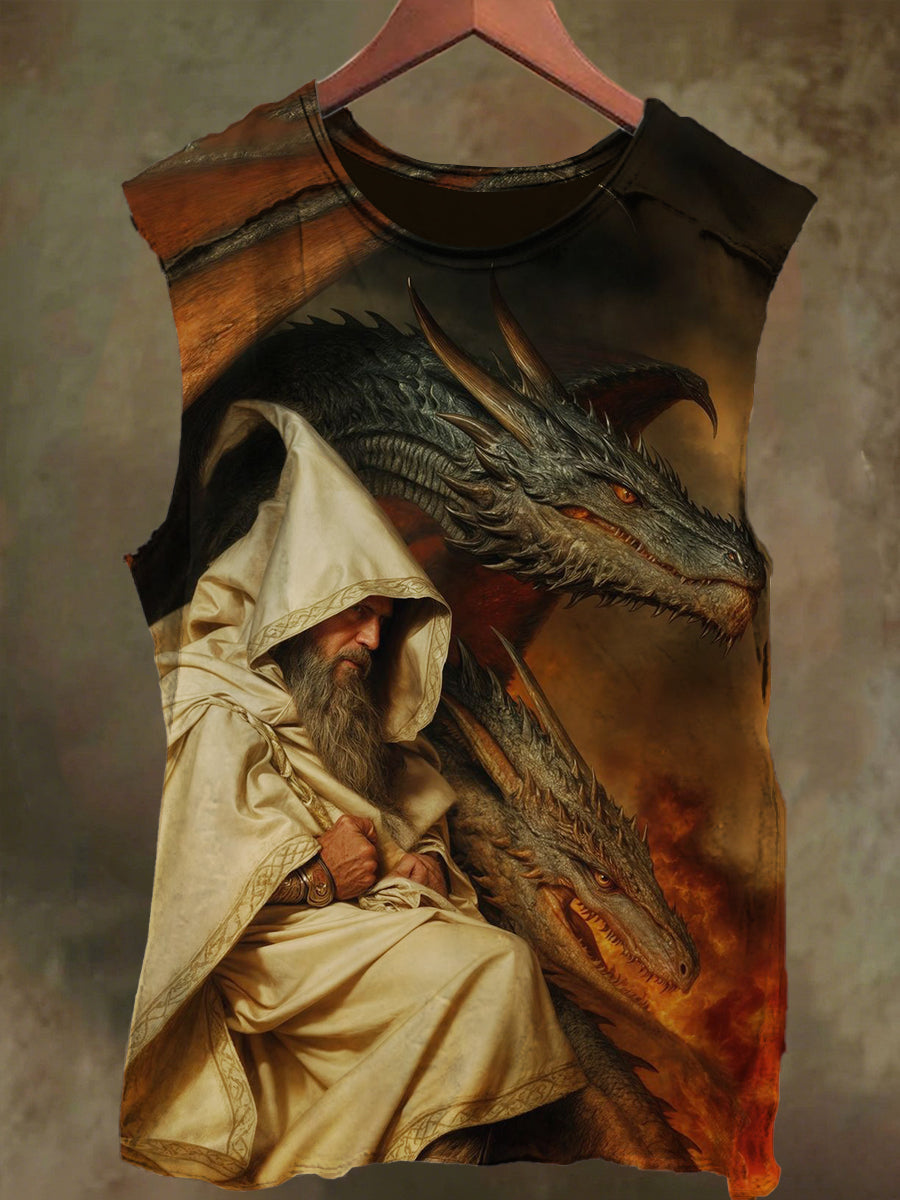 Unisex Dragon and Wizard Print Casual Cotton Tank Top