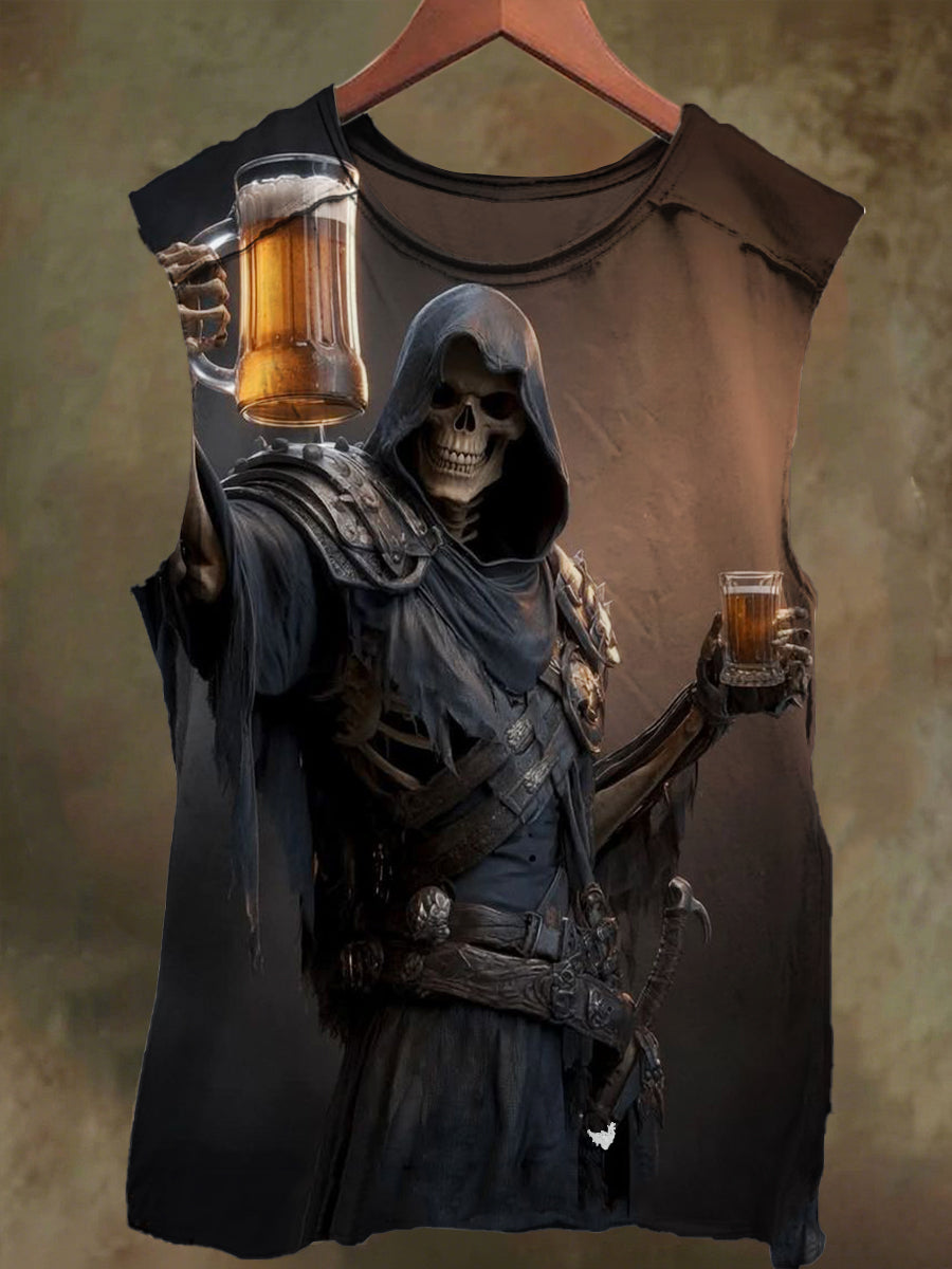 Unisex Drinking Skull Print Casual Cotton Tank Top