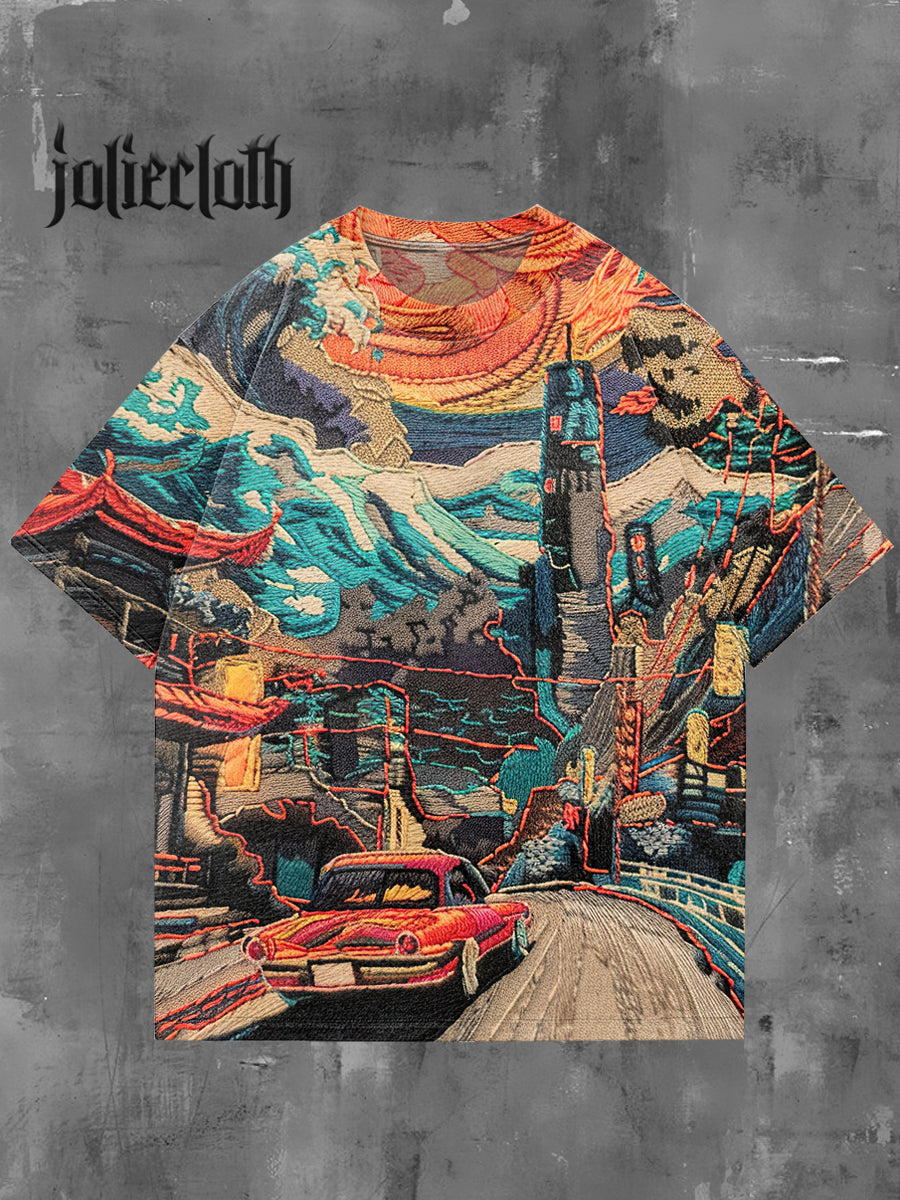 Unisex Fantasy Car Embroidery Art Illustration Casual Cotton Short Sleeve T-shirt