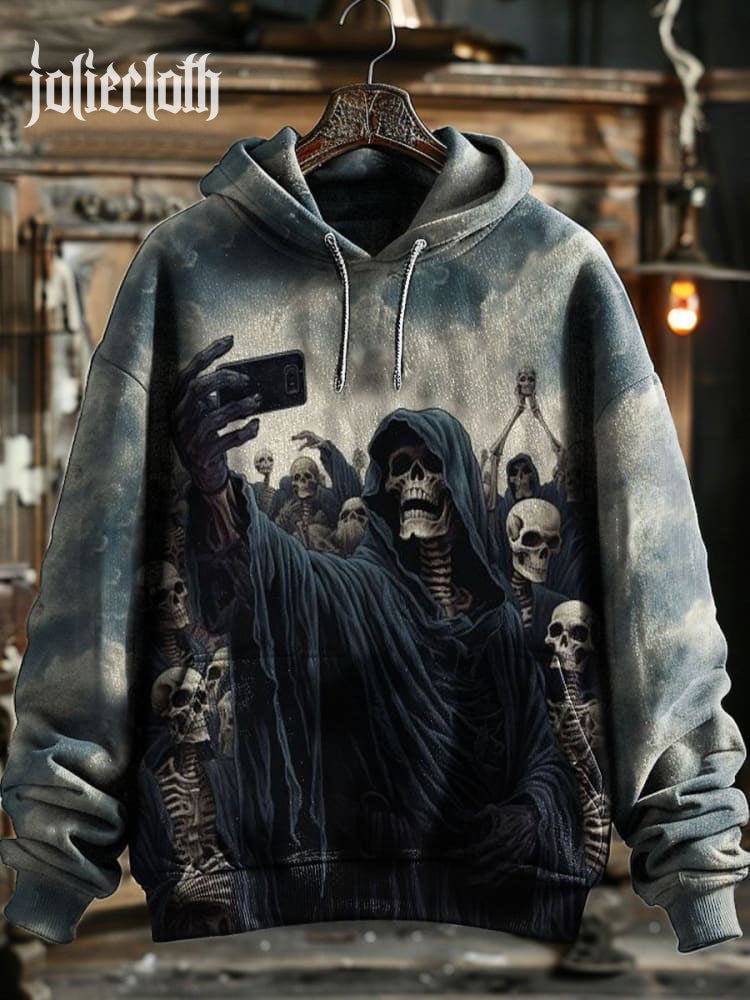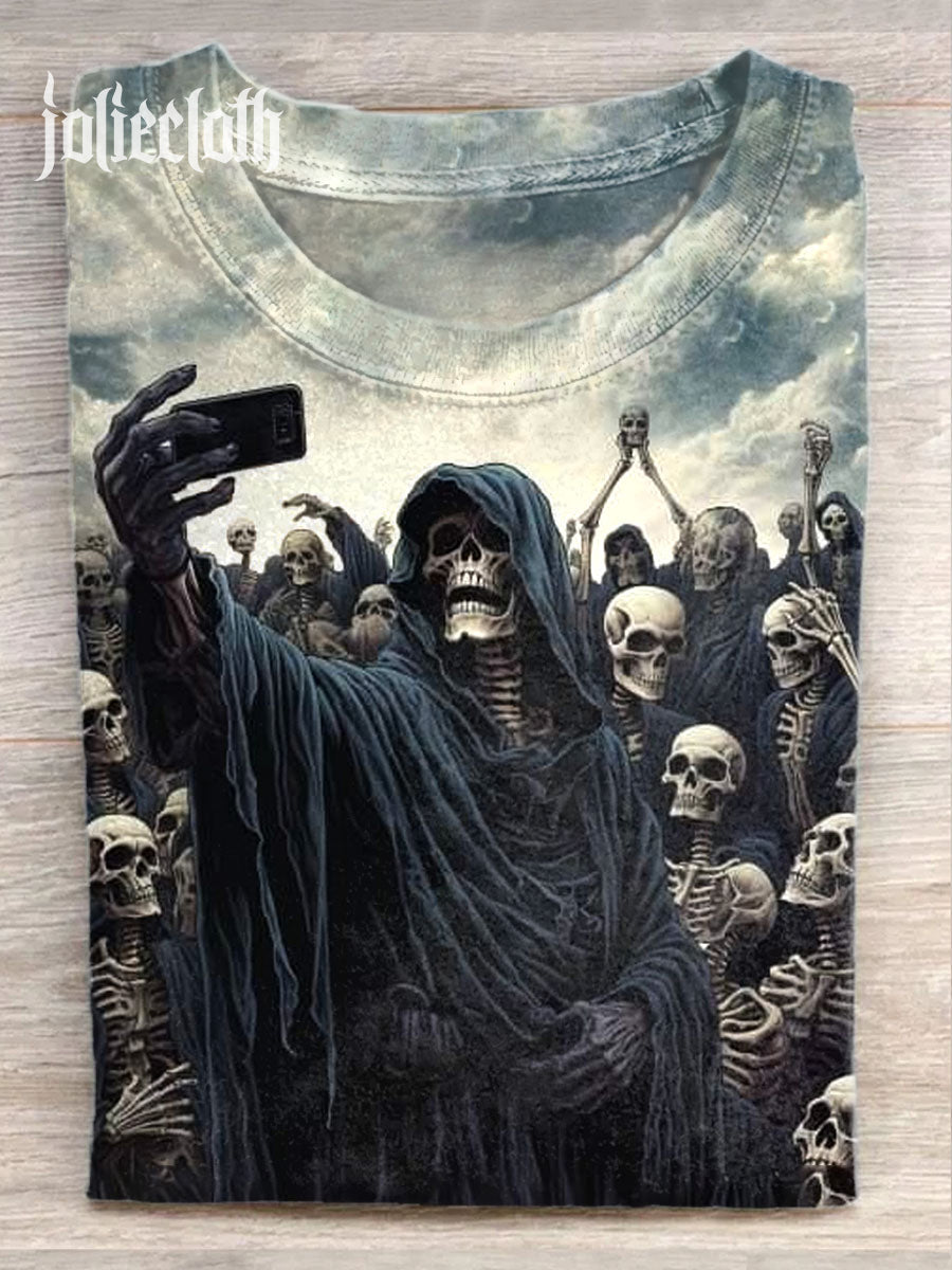 Unisex Funny Selfie Skeleton World Art Illustration Printed Casual Cotton T-Shirt