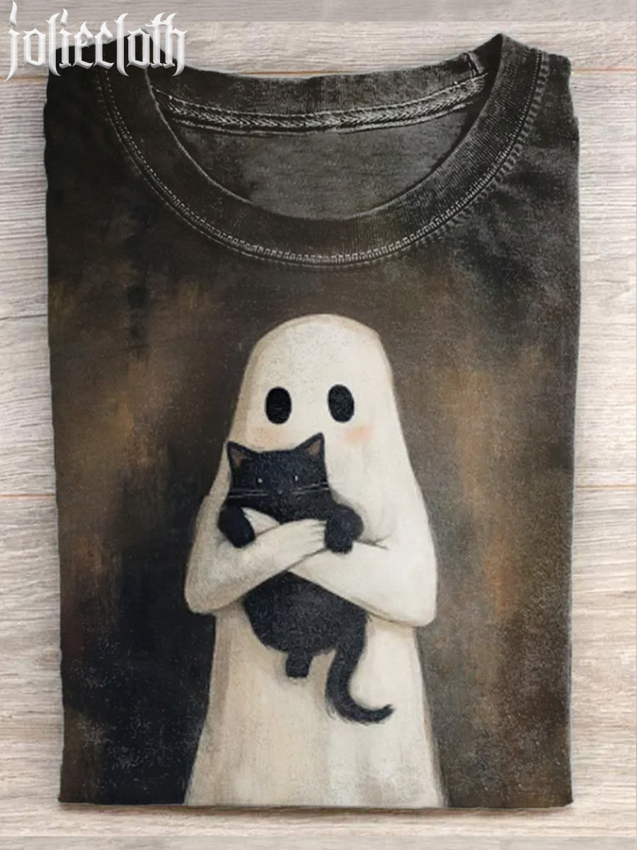 Unisex Halloween Imp And Cat Illustration Print Casual Short Sleeve T-Shirt