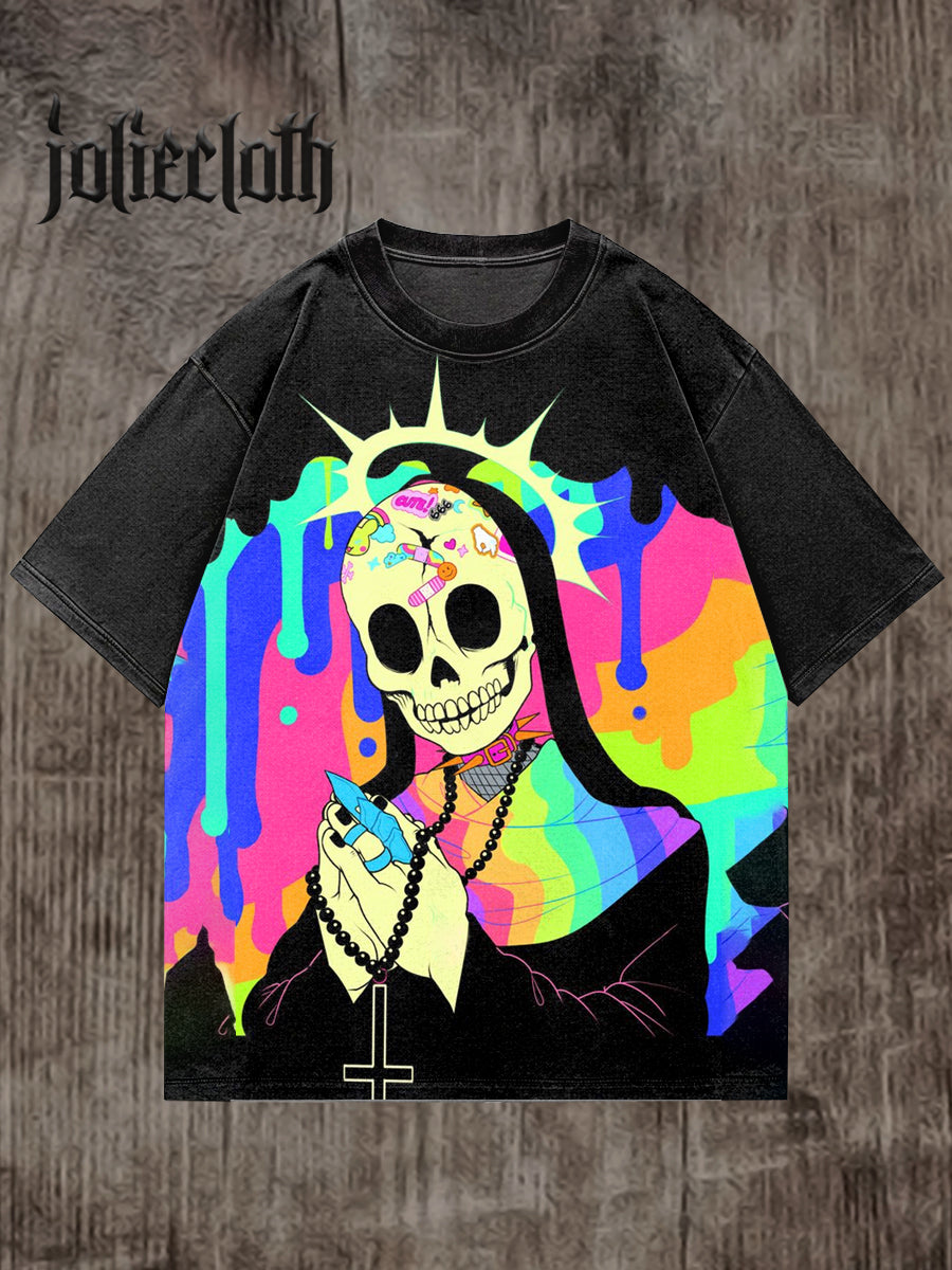 Unisex Skeleton Nun Art Graffiti Illustration Casual Cotton Short Sleeve T-Shirt