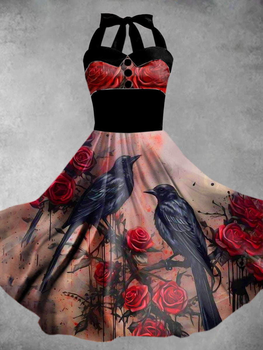 Women's Gothic Crow Illustration Print Sleeveless Suspender Dress