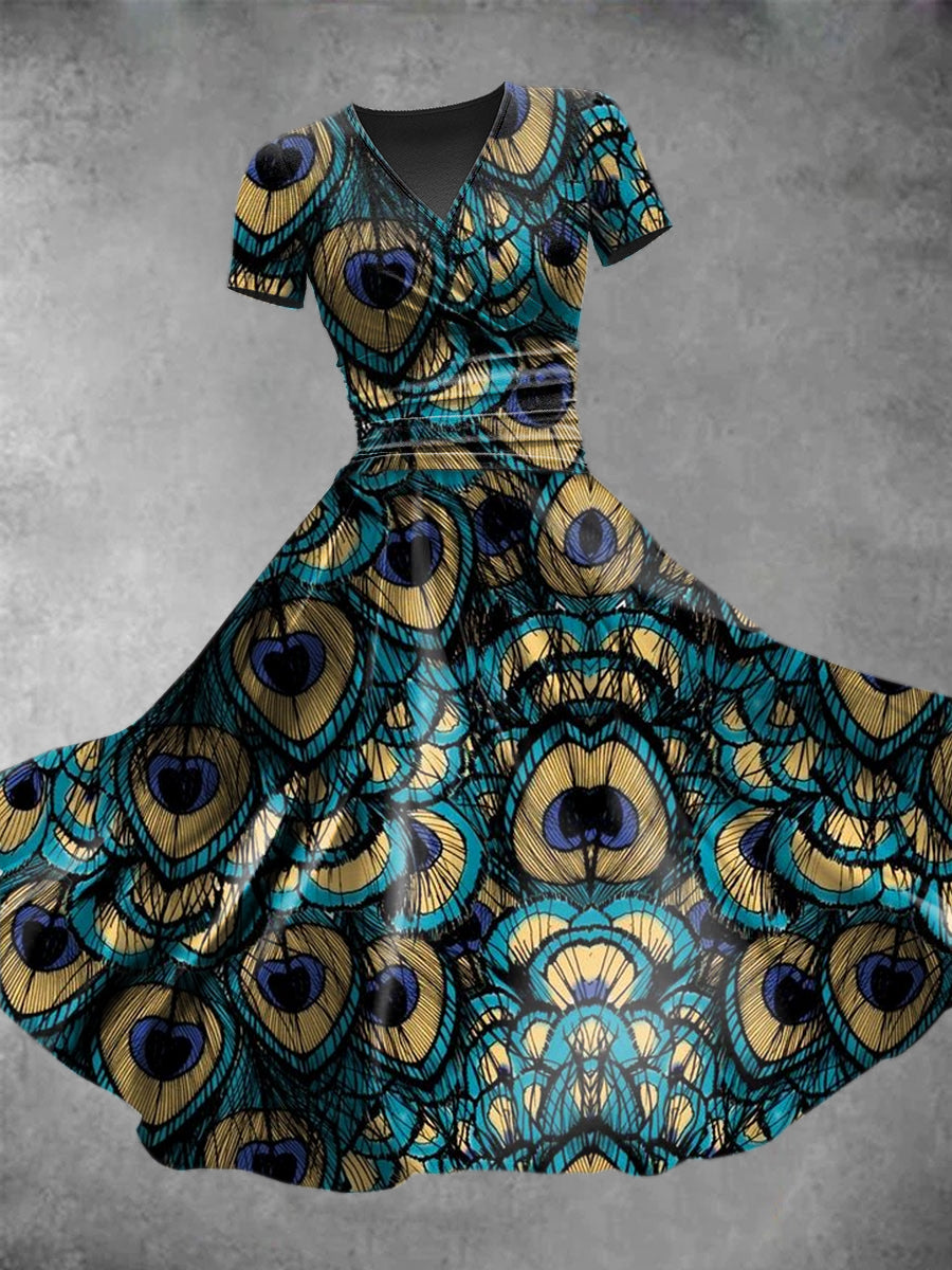 Women's Peacock Feather Illustration Casual Short Sleeve V-Neck Dress